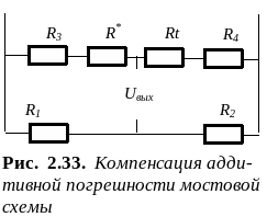 Коррекция дрейфа нуля осуществляется включением в смежные плечи моста двух резисторов: Rt и R* (рис. 2.33). Сопротивление первого зависит от температуры, так, что знак изменения сопротивления противоположен знаку ЧЭ. Сопротивление второго не зависит от температуры и служит для начального симметрирования моста.