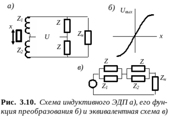 Основу электромагнитных датчиков положения (ЭДП) составляют индуктивные или индукционные ЧЭ. Самые простые ЭДП строятся на базе индуктивных ЧЭ дроссельного типа. Пример такого ЭДП с дифференциальным включением катушек, его функция преобразования и эквивалентная схема представлены на рис. 3.10. Номиналы ЧЭ Z0 при перемещении сердечника изменяются в пределах: Z1 = Z0 + DZ и Z2 = Z0 - DZ, а функция преобразования может быть описана выражением вида: