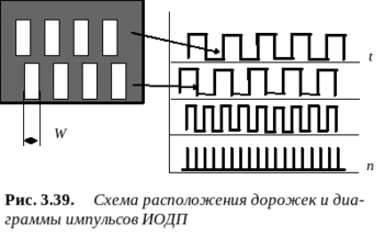 Оптико-механические системы простейших ИОДП выполнялись безредукторными и содержали блок осветителя, кодирующую шкалу и фотоэлемент. В современных конструкциях ИОДП шкала содержит несколько дорожек и смещенных на нецелое число шагов фотоэлементов. При такой схеме значительно уменьшается цена управляющего импульса, определяющая разрешающую способность датчика. Так, например, в датчиках фирмы Ferranti используются шкалы с 1250 ... 10000 штрихами и два фотодиода, причем штрихи дорожек смещены друг относительно друга на четверть шага (рис. 3.39). Одновибраторы измерительной схемы ИОДП формируют и подают на счетчик два импульса с обеих дорожек - по переднему и заднему фронту каждого штриха, и поэтому, при вращении вала на один оборот шкалы возбуждается импульсов в 4 раза больше числа делений. Для шкалы с 1250 штрихами это соответствует 5000 импульсам на оборот.