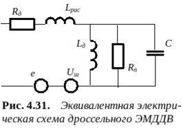 Эквивалентная электрическая схема ЭМДДВ, как и любого частотно-зависимого преобразователя учитывает вклад отдельных элементов конструкции, зависящий от рабочей частоты прибора. В представленной на рис. 4.31 эквивалентной электрической схеме дроссельного ЭМДДВ с ферромагнитным сердечником символами Lд и Rд обозначены индуктивность и сопротивление обмотки. При работе датчика на частотах 103 ... 104 Гц необходимо также учесть сопротивление потерь мощности на перемагничивание Rп и межвитковую емкость C, а также характерные для индуктивных преобразователей источники ЭДС e и Uш. Здесь Uш - напряжение шума, обусловленное эффектом Баркгаузена. Этот эффект, особенно заметный в высокочувствительных приборах (например, феррозондах) связан со скачкообразными смещениями доменных границ при перемагничивании ферромагнетика. Он вызывает импульсы ЭДС eБ в области средних частот, eБ = Ф/ , где Ф - приращение магнитного потока, вызванное скачком Баркгаузена, - длительность скачка. Длительность этих скачков для разных материалов составляет 10-3... 10-7с. Что касается ЭДС e, индуцируемой в контуре, то она может быть как информативной, так и помехой. Использование сердечников с высокой магнитной проницаемостью и высоким удельным сопротивлением (например, ферритов) позволяет практически устранить потери из-за Lрас и токов Фуко.