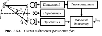 Работа на самых малых расстояниях и в режиме наведения требуют применения ФМ (рис. 5.53). В этом случае, прием отраженного сигнала осуществляется двумя приемниками, причем разность хода лучей вызывает разность фаз принятых сигналов. Так, если сигнал, полученный первым приемником, имеет вид U1 = U cos 0t, то для второго справедливо U2 = U cos (0t-), где фазовый сдвиг = 2/ = (2D/) sin и D - база приемников (расстояние между ними).