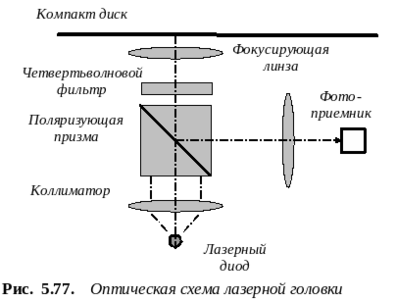 Оптическая схема головки наведения работает следующим образом (рис. 5.77). Свет лазера проходит через коллиматор, линейно поляризуется призмой (расщепителем), далее - сквозь четвертьволновую пластинку и отражается от диска. При отражении и прохождении через четвертьволновую пластинку обратно характер распространения световых волн изменится - на расщепитель попадет свет с перпендикулярной поляризацией по отношению к исходной. Этот свет уже не пройдет сквозь призму и отражается ею на светоприемники.