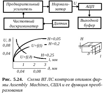 Весьма важной областью применения ВТ ЛС, является область неразрушающего контроля изделий металлургической промышленности. Поскольку структурное состояние металлов влияет на их электрические и магнитные свойства, оказывается возможным контролировать не только сплошность материала, но и его химический состав, а также качество термической обработки и состояние поверхностного слоя после механической обработки. Схема такой системы для автоматизации процесса контроля сплошности отливок, представлена на рис. 5.24. Система включает несколько разнотипных ВТ датчиков, что позволяет детерминировать различные дефекты и их параметры: наружные царапины и их глубину H, длину l и глубину залегания трещин и раковин. Выходным сигналом ВТ датчика является изменяющаяся частота генерации, которая с помощью частотного дискриминатора преобразуется в аналоговый амплитудный сигнал, пропорциональный измеряемому параметру. Усилитель и нормализатор несколько выравнивают функцию преобразования, хотя она все равно остается нелинейной.