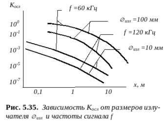 ервый из этих факторов связан с тем, что по мере удаления волны от источника его энергия распределяется во все большую границу волнового фронта, уменьшая, тем самым, интенсивность волны J. Амплитуда сферической волны убывает r--1, цилиндрической r--1/2. В УЗ локации также используют представление о коэффициенте ослабления Kосл = Wпр/Wизл (здесь Wпр и Wизл - величина мощности сигнала на входе приемника и выходе передатчика). Kосл уменьшается с расстоянием между объектами связи и зависит от размеров излучателя и частоты сигнала (рис. 5.35). В УЗ локации значение Kосл превышают 100 дб.