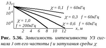 где - коэффициент затухания, x - направление распространения волны. (В формулах учтено, что интенсивность звука J пропорциональна квадрату амплитуды волны u (или давления p), и волна при локации проходит двойной путь 2х). Коэффициент затухания измеряется в Нп/м или дБ/м, причем 1 дБ/м = 0,115 Нп/м.