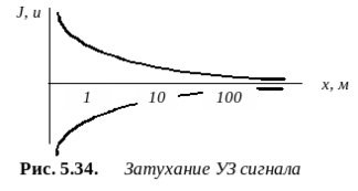 Затухание УЗ сигнала представляет собой уменьшение амплитуды u и, следовательно, интенсивности J звуковой волны по мере ее распространения (рис. 5.34):