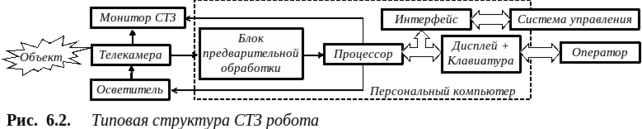 аиболее распространенной схемой СТЗ является однопроцессорная схема, которая строится на базе персонального компьютера. Системы такого рода иногда называются персональными (рис 6.2). Более 80% эксплуатируемых СТЗ относятся к однопроцессорным. В ряде случаев, предварительная обработка изображений осуществляется аппаратно, с помощью специализированных устройств ввода - фреймграбберов. Так были организованы, в частности, отечественные системы типа «Videoscan» и «Megapixel». Однопроцессорная структура относится к первому поколению СТЗ и имеет существенный недостаток - невозможность обработки сложных (в том числе - цветных) изображений в реальном масштабе времени. Относительно низкое быстродействие этих систем обусловлено невозможностью распараллеливания вычислений и отсутствием специальной шины для передачи изображений. Наиболее распространенным путем повышения производительности СТЗ явилась идеология фирмы Data Translation (США), предполагающая не только аппаратную фильтрацию изображений, но и использование в устройстве ввода программируемых логических матриц, позволяющих изменять алгоритм обработки в зависимости от типа и характера изображения. В большинстве случаев персональная СТЗ включается в состав системы управления соответствующим оборудованием, а ее обучение осуществляется в ручном или полуавтоматическом режиме оператором.