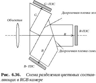 апись видеосигналов на магнитную пленку производится видеокамерами. Большинство из них в качестве датчика изображений используют ПЗС-матрицы разной размерности. Так, типовая матрица размером 0,5 дюйма содержит 400000 элементов, разделенных на 581 строку и 756 столбцов. В последних моделях количество элементов превышает 106. В простых мобильных видеокамерах формируется композитный видеосигнал (он обычно присутствует на видеовыходе или разъеме SCART), в камерах среднего класса - компонентный. Телекамеры этих типов получили общее название camcorder (от англ. camera + recorder - записывающая камера). Тип выходного сигнала какордера зависит от формата записи - композитный, например, в VHS и SVHS камерах и компонентный - в камерах типа Betacam. Для профессиональных целей применяются цветные RGB-камеры, содержащие три ПЗС-матрицы, отдельно на каждую цветовую составляющую (рис. 6.36). На выходе RGB-камеры присутствуют как стандартный композитный видеосигнал, так и отдельно три цветовые составляющие. Следствием этого является возможность прямого подключения цветовых каналов, что улучшает качество воспроизведения.