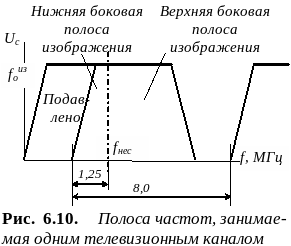 олный телесигнал передается путем АМ несущей частоты, следовательно, его частотный спектр содержит несущую частоту fнес и две боковые полосы. (В отличие от изображения сигнал звукового сопровождения в телевидении обычно представляет собой ЧМ колебание несущей частоты). Как известно, ширина спектра такого сигнала определяется удвоенной максимальной частотой модулирующего сигнала fв. Поэтому, радиосигнал изображения в отечественном вещании занимает полосу 13 МГц. Для АМ сигнала характерно, что каждая из боковых частот содержит полную информацию о сигнале. Следовательно, без потери качества можно одну из них подавить, сузив, тем самым, и спектр сигнала. Обычно, частично (для сохранения несущей частоты) подавляется нижняя боковая частота (1,25 МГц), верхняя же передается полностью (рис. 6.10). Применительно к телевещанию, это позволяет увеличить число передаваемых каналов в отведенном диапазоне волн. Во всех случаях АМ fнес должна в несколько раз превышать максимальную частоту fв спектра модулирующего сигнала. Например, в отечественном стандарте наименьшая несущая частота соответствует I частотному каналу и равна 49,75 МГц.
