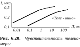 Разрешающая способность (разрешение) n характеризует свойство телекамеры к воспроизведению мелких деталей. Она показывает, насколько четким получается изображение объекта. Обычно, разрешение измеряется в телевизионных линиях - твл - вертикальных полосах, расположенных по экрану телекамеры. На практике n определяется с помощью разнообразных тестовых таблиц, отдельно для черно-белого и цветного изображений. Например, тестовая испытательная таблица ИТМ-05-98 предназначена для визуальной оценки разрешающей способности по цвету по горизонтали и вертикали на соответствие международным нормам и отечественным стандартам. Она позволяет анализировать аналоговое изображение в системах PAL, SECAM, NTSC, RGB, компонентный сигнал Y, R-Y, B-Y, а также цифровые изображения в форматах 4:2:2, 4:2:0, 4:1:1 и т.п. Для современных телекамер n = 380 ... 600 линий и различается по длине и ширине экрана. В направлении кадровой развертки она ограничена количеством строк разложения. Разрешающая способность зависит как от освещенности, понижаясь с уменьшением последней ниже определенного предела, так и от материала мишени (рис. 6.19).