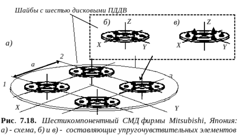 Пример шестикомпонентного СМД высокой жесткости представлен на рис. 7.18а. Четыре упруго-чувствительных элемента образуются набором из трех блоков, каждый из которых состоит из шести дисковых пьезодатчиков конкретной поляризации. На рис. 7.18б и в показаны блоки, измеряющий деформации в горизонтальной плоскости и вдоль вертикальной оси Z соответственно. Подобное расположение упруго-чувствительных элементов позволяет вычислить все шесть компонент главного вектора сил и моментов F: