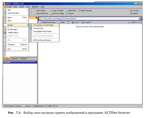 Запустить ACDSee browser. В окне программы нужно выбрать пункт «Acquire from Camera or Card Reader» из меню «File» (рис. 7.3)