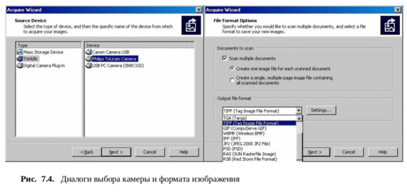 В появившимся окне следует нажать кнопку "Next". Далее необходимо выбрать камеру Philips ToUcam, формат сохранения изображений .TIF (также поддерживаются форматы .BMP и .PIC), отметить пункт "Create one image for each scanned document" (рис. 7.4).