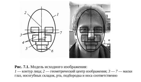 Рассмотрим некоторые особенности системы распознавания на примере алгоритма распознавания лиц. Представим упрощенную модель лица в виде набора некоторых элементов прямоугольной формы — масок. Каждую маску будем характеризовать двумя геометрическими признаками — площадью и расстоянием от геометрического центра маски до выбранного центра изображения. Анализируются семь масок: правый глаз, левый глаз, нос, рот, правая и левая носогубные складки и подбородок. Центром изображения является геометрический центр лица (эта точка приблизительно соответствует середине переносицы, рис. 7.1).