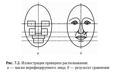 Алгоритм распознавания (верификации) близок к алгоритму регистрации, только поиск элементов лица ведется уже с помощью масок, полученных из модели лица, зарегистрированного ранее (рис. 7.2). Другими словами, модель распознаваемого лица зависит от того, с какой моделью ее собираются сравнивать. Поэтому, данный алгоритм является несимметричным. Это приводит к тому, что при сравнении «лица 1» с «лицом 2» и наоборот, могут получиться разные результаты. При верификации вычисляется так называемый «счет сравнения», получаемый как функционал, зависящий от линейной комбинации эвклидовых расстояний элементов лица двух моделей, а также от линейной комбинации минимальных значений откликов, полученных при создании модели верифицируемого лица.