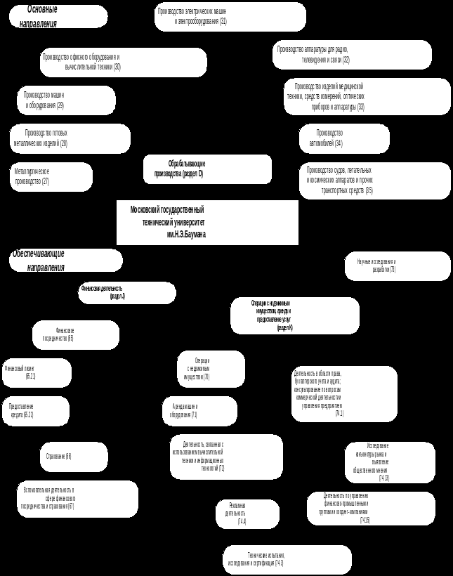 ОКВЭД используется для классификации и кодирования видов экономической деятельности, заявляемых хозяйствующими субъектами при регистрации. В курсовой работе, при выборе видов экономической деятельности для регистрируемого предприятия, следует руководствоваться схемой на рис. 1. На этой схеме представлены виды экономической деятельности по основным направлениям подготовки специалистов в МГТУ им. Н.Э.Баумана.