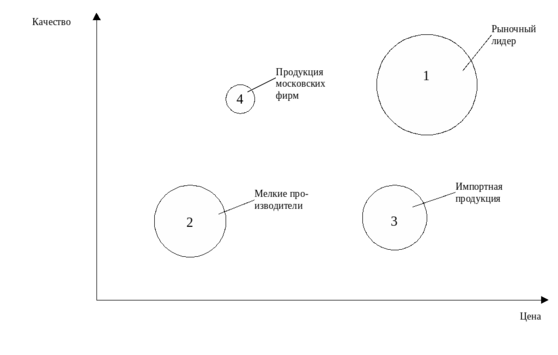редприятия со схожими характеристиками объединить в стратегические группы. Размер круга, изображающего каждую группу, должен быть прямо пропорционален объему продаж группы в соответствующей области позиционной карты.