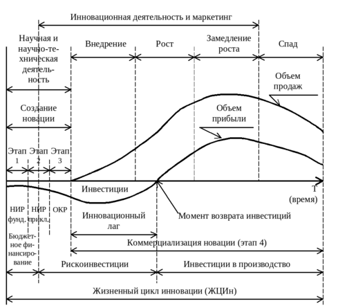 Период времени от зарождения идеи, создания и распространения новшества и до его использования принято называть жизненным циклом инновации (ЖЦИн). С учетом последовательности проведения работ жизненный цикл инноваций рассматривается как инновационный процесс.