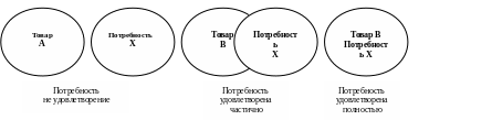 Можно изобразить конкретный товар и конкретную человеческую потребность в виде кругов, а способность товара удовлетворить эту потребность представить в виде степени их совмещения. На рис. 1 показано, что товар А не удовлетворяет потребность X, товар Б удовлетворяет ее частично, а товар В ― полностью. В этом случае товар В будет называться «идеальным товаром».
