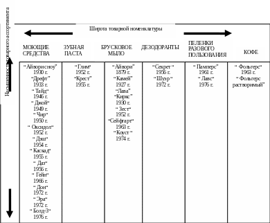 Под насыщенностью товарной номенклатуры корпорации «Проктер энд Гэмбл» имеют в виду общее число составляющих ее отдельных товаров. На рис. 53 представлен 31 товар.