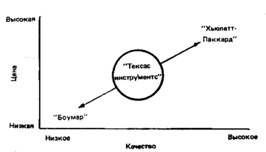 Двустороннее наращивание. Фирма, работающая в среднем эшелоне рынка, может принять решение о наращивании своего товарного ассортимента и вверх и вниз одновременно. Примером может служить стратегия деятельности фирмы «Тексас инструментс» на рынке карманных калькуляторов. До появления фирмы на этом рынке его нижние эшелоны по показателям цены и качества были в основном захвачены компанией «Боумар», а верхние ¾ по тем же показателям цены и качества ¾ корпорацией «Хьюлетт-Паккард» (см. рис. 52). Фирма «Тексас инструментс» предложила свои первые калькуляторы в среднем эшелоне рынка как товары средней цены и среднего уровня качества. Постепенно она начала наращивать свой ассортимент в обоих направлениях. Она предложила более совершенные калькуляторы по тем же ценам, а то и ниже, что и компания «Боумар», и в конце концов ликвидировала ее как конкурента. Одновременно фирма «Тексас инструментс» разработала высококачественные калькуляторы, стала продавать их дешевле, чем стоили калькуляторы корпорации «Хьюлетт-Паккард», и отбила у последней добрую долю продаж в верхних эшелонах рынка. Такая стратегия двустороннего наращивания помогла фирме «Тексас инструментс» захватить лидерство на рынке карманных калькуляторов.