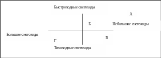 Предположим, фирма узнаёт, что покупателей целевого сегмента интересуют в первую очередь два параметра снегоходов: размеры и скорость. Потенциальных клиентов и дилеров можно опросить, как воспринимают они с точки зрения этих параметров снегоходы конкурентов. Результаты опроса представлены на схеме позиционирования товаров на рис. 48. Конкурента «А» считают производителем маленьких быстроходных снегоходов, конкурента «Б» ¾ производителем снегоходов средних размеров и средних скоростных показателей, конкурента «В» ¾ производителем тихоходных снегоходов малых и средних размеров и конкурента «Г» ¾ производителем больших тихоходных снегоходов. Площади кружков на схеме пропорциональны объемам продаж каждого из этих конкурентов 1б.