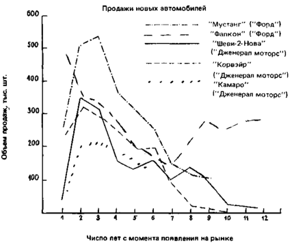 Понятие жизненного цикла можно применить для описания целого товарного класса (автомобили с бензиновыми двигателями), разновидности товара (автомобили с откидным верхом) или конкретной марки («Мустанг»). В каждом из этих случаев понятие жизненного цикла имеет разный характер. Самый длительный цикл жизни у товарных классов. Сбыт многих товарных классов надолго задерживается в рамках этапа зрелости. И наоборот. Разновидности обычно имеют типичную кривую жизненного цикла. Такие товары, как телефоны с наборным диском и кремы-дезодоранты, проходят обычный цикл выведения на рынок, быстрого роста, зрелости и упадка. История индивидуальной марки зависит от ее успеха и от эффективности атак и контратак конкурентов. Жизненные циклы ряда хорошо известных марок автомобилей представлены на рис. 57.
