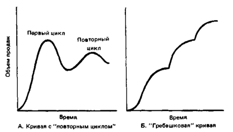 Хотя представленная здесь кривая жизненного цикла товара типична, она не всегда имеет такой вид. Одним из часто встречающихся вариантов является кривая «с повторным циклом» (см. рис. 56а)6. Второй «горб» сбыта вызывается мероприятиями по стимулированию сбыта, проведенными на этапе упадка товара. Еще одной разновидностью является «гребешковая» кривая (см. рис. 56б), состоящая из последовательного ряда циклов, порожденных открытием новых характеристик товара, новых способов его использования, появлением новых пользователей, Так, например, кривой «гребешкового» вида характеризуется сбыт нейлона, что объясняется появлением с течением лет множества новых сфер его использования ― парашюты, чулки и белье, рубашки, ковровые покрытия.