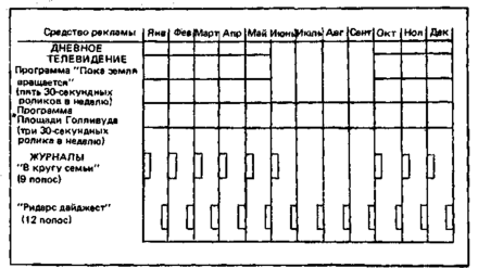 Решения о выборе конкретных носителей рекламы и временном графике их использования можно представить в виде схемы. График использования средств рекламы, показанный на рис. 80, говорит о том, что в программе «Пока Земля вращается» рекламу будут давать по будням ежедневно, за исключением летних месяцев, и программе «Площади Голливуда» ¾ в течение всего года по 3 раза в неделю, в журнале «В кругу семьи» ¾ в начале каждого месяца, за исключением летних, а в журнале «Ридерс дайджест» ¾ ежемесячно.