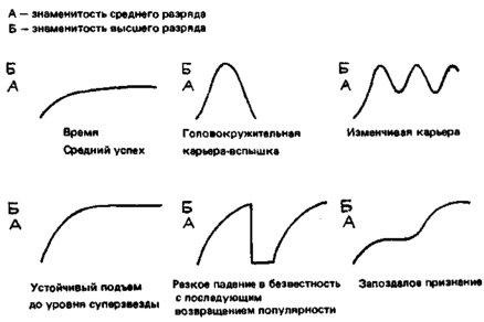 Менеджеры знаменитостей осознают, что жизненные циклы «звезд» резко отличны друг от друга по своей продолжительности и часто бывают очень короткими (см. рис. 95). Руководитель службы маркетинга фирмы «Полиграм», одной из крупных компаний грамзаписи, сравнивает карьеру исполнителя с ящиком клубники, которую нужно упаковать, доставить на рынок и продать, пока она не испортилась и не потеряла всякую ценность. Директор службы общенациональной пропаганды фирмы «Меркурий рекордс» описывает типичное рабочее совещание следующим образом: «Мы собираемся раз в шесть недель. Анализируем показатели продаж. Если решаем, что какая-то группа «не тянет», т. е. ее не транслируют или не идут ее записи, мы отказываемся от нее. Ведь если стимулирование не дает результатов, незачем впустую выбрасывать дополнительные деньги» 10. Некоторые бывшие знаменитости, такие, как певец Эдди Фишер, пытаются возродить свою карьеру, но вернуться наверх оказывается сложно11.