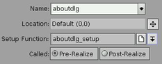 1. Поскольку Вы хотите, чтобы функция aboutdlg_setup вызывалась перед открытием диалога, убедитесь, что включена кнопка "Pre-Realize".