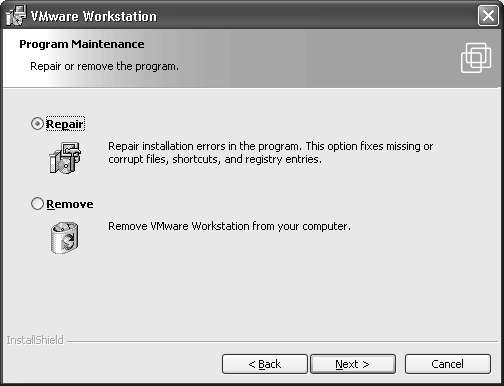 Как было сказано выше, программа установки VMware использует службу Windows Installer. Благодаря этому вы можете в случае повреждения или удаления программных файлов VMware восстановить работоспособность приложения без его переустановки. Для этого необходимо проделать следующее.