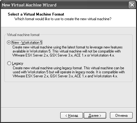 • возможностью выбора формата создаваемой ВМ — “нового” (New — Workstation 5), который обеспечивает наличие у ВМ улучшенных характеристик (по сравнению с предыдущей версией VMware), но не совместим с продуктами VMware Workstation 4.x, GSX Server 3.x, ESX Server 2.x и ACE 1.x, либо “старого” (Legacy), совместимого с перечисленными продуктами (для выбора формата требуется установить соответствующий переключатель во втором окне мастера, показанном на рис. 3.14);