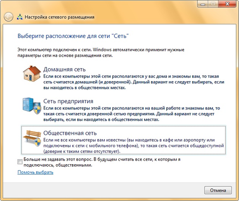 Общественная сеть. Это сетевое расположение предназначено для использования компьютера в таких общественных местах, как кафе или аэропорты. Это наиболее строгое размещение, у которого по умолчанию отключены возможности присоединяться к домашней группе и сетевое обнаружение.