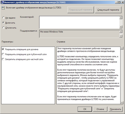 В оснастке «Редактор управления групповыми политиками» разверните узел Конфигурация компьютера/Политики/Административные шаблоны /Сеть/ Обнаружение топологии связи (Link Layer) и выберите политику «Включает драйвер отображения ввода /вывода (LLTDIO)»;