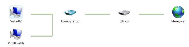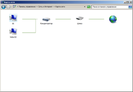 Карта сети – это графическое представление расположения компьютеров и устройств, которое позволяет увидеть все устройства вашей локальной сети, а также схему их подключения друг к другу. В окне «Центр управления сетями и общим доступом» отображается только локальная часть сетевой карты, компоновка которой зависит от имеющихся сетевых подключений. Компьютер, на котором выполняется создание карты, отображается в левом верхнем углу. Другие компьютеры подсети отображаются слева. Такие устройства инфраструктуры, как коммутаторы, концентраторы и шлюзы в другие сети отображаются справа. Пример карты сети вы можете увидеть на следующей иллюстрации: