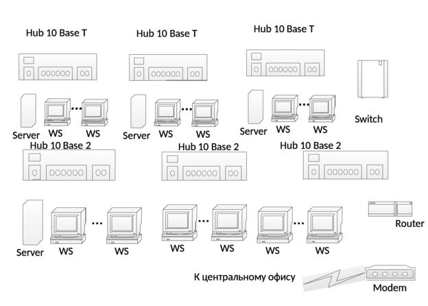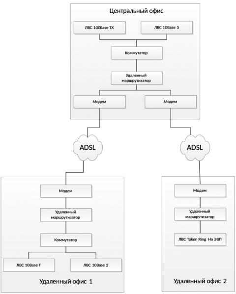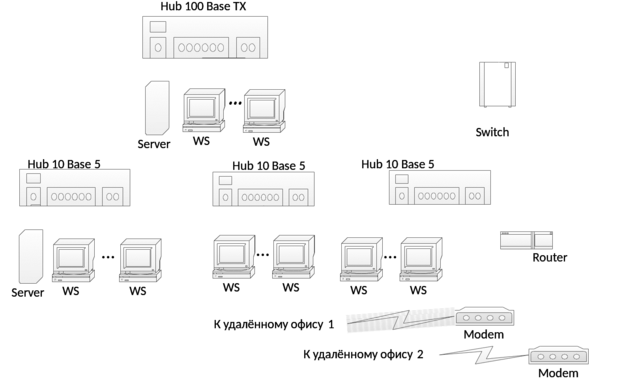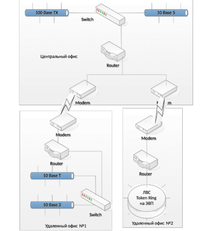 В центральном офисе фирмы расположены ЛВС 100 Base TX , содержащая один концентратор, и ЛВС 10 Base 5, содержащая три сегмента. Обе сети подключены к коммутатору, к нему также подключен удаленный маршрутизатор с двумя модемами.
