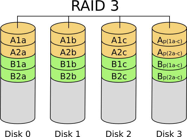 RAID-3. Отказоустойчивый массив с параллельным вводом/выводом и диском контроля четности. При огромном размере файла поток данных разбивается на блоки на уровне байт и записывается параллельно на все диски массива, кроме диска, который выделен для хранения контрольных сумм, вычисляемых при записи данных. Количество дисков должно быть не менее 3. Если из строя выходит 1 диск, то всю потерянную информацию можно восстановить по контрольной сумме, а если 2 диска, то система выходит из строя. Недостаток уровня в том, что один диск работает, а остальные простаивают.