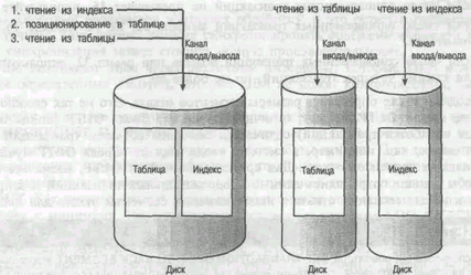 Одним из наиболее важных способов уравновешивания ввода/вывода является размещение данных таблиц и индексов на отдельных физических устройствах, как показано на рис. 3. Если данные аблицы и индекса находятся на одном и том же дисководе, при любом типе доступа к таблице с использованием индексов объем операций ввода/вывода удваивается. Возьмем, например, операцию SELECT. Нужно обратиться к индексу, чтобы определить самый быстрый способ доступп к информации таблицы, а затем обратиться к самой таблице. При этом все операции должны ждать окончания доступа к таблице или индексу, что приводит к резкому снижению производительности всех операций, особенно тех, которые связаны с одновременным доступом многих пользователей к данным одних и тех же таблиц. После размещения таблиц и индексов на разных дисководах головки дисковода начинают работать синхронно с базой данных, быстро обращаясь к данным таблицы и возвращая их пользователям.