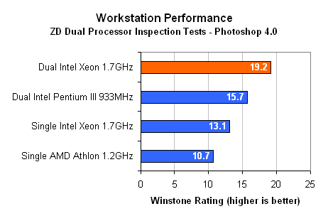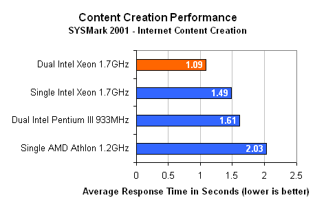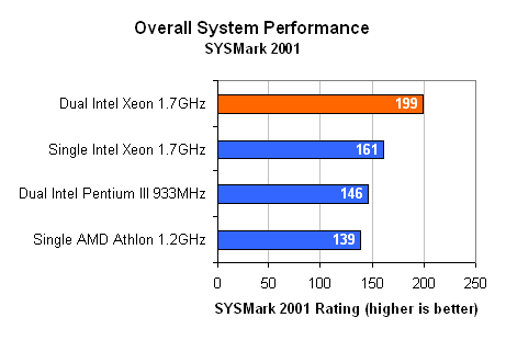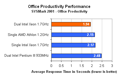 Если посмотреть на общий прирост производительности в SYSMark 2001 при переходе к двухпроцессорной конфигурации Xeon, то он составляет 24%. Однако эта цифра сильно зависит от типа приложения и может существенно отличаться. Если вы запускаете (в многозадачном режиме) много приложений для создания Интернет-контента, то переход к двум процессорам принесет вам существенную пользу. Однако если сфера вашей компьютерной деятельности ограничена офисным спектром задач, то вы будете стрелять из пушки по воробьям.