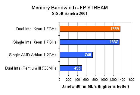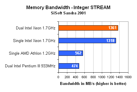 Из двух этих тестов вы должны понять главное: пропускная способность двухпроцессорной системы на Xeon 1,7 ГГц не больше, чем у одного Xeon, работающего на той же частоте. К сожалению, сей факт означает, что при повышении тактовой частоты нехватка пропускной способности памяти на двухпроцессорной Xeon системе будет ощущаться быстрее, чем на однопроцессорной Xeon (или Pentium 4) системе.