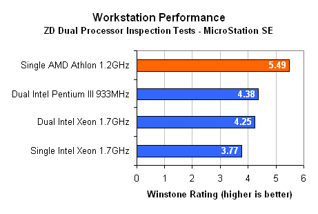 Microstation SE является пакетом моделирования/CAD и очень сильно нагружает FPU. Мы уже делали вывод о том, что FPU на Xeon (и Pentium 4) очень плохо выполняет неоптимизированный x87 код, который наличествует в этом тесте. Это позволяет Athlon-у, известному своим сильным FPU, превосходить не только однопроцессорную систему на Xeon, но и двухпроцессорные системы на Xeon и Pentium III. Даже система на Pentium III 933 МГц превосходит Xeon 1,7 МГц, так как она лучше справляется с неоптимизированным x87 кодом, который используется в большинстве современных "тяжелых" приложений. Для того чтобы Xeon показал здесь свою мощь, приложение должно поддерживать SSE2 инструкции.