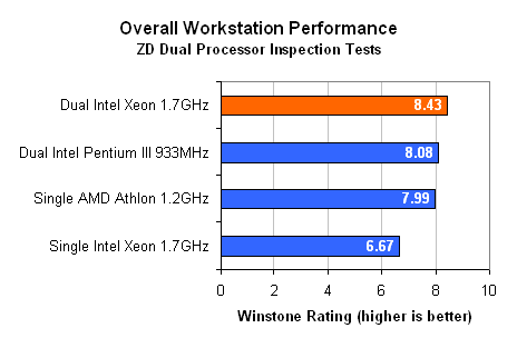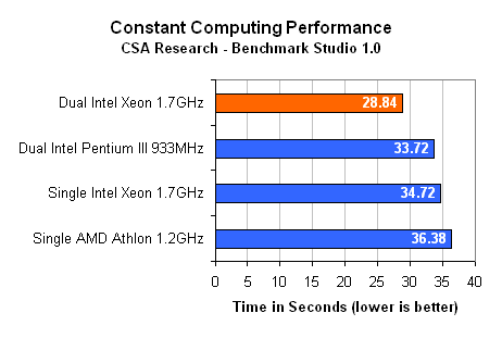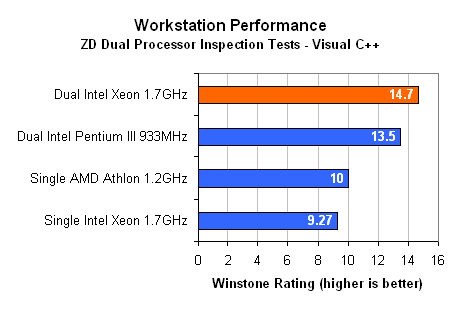 Во-вторых, двухпроцессорная система Intel Xeon 1,7 ГГц прошла тест за 64% времени по сравнению с одним Xeon 1,7 ГГц или двумя Pentium III 933 МГц.