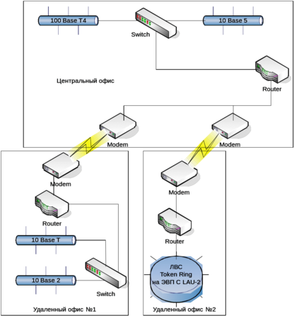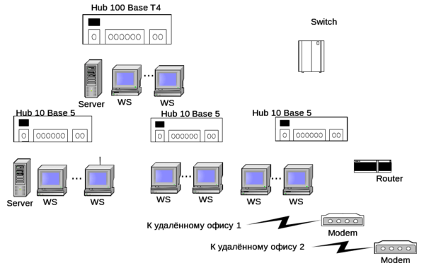 В центральном офисе фирмы расположены ЛВС 100 Base T4 , содержащая два концентратора, и ЛВС 10 Base 5, содержащая четыре сегмента. Обе сети подключены к коммутатору, к нему также подключен удаленный маршрутизатор с двумя модемами.
