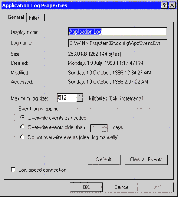Системные администраторы частенько забывают о необходимости контроля за журналами событий, и те переполняются. Чтобы этого не произошло, нужно запустить программу Administrative Tools из окна Control Panel, открыть Event Viewer и щелкнуть правой кнопкой мыши на каждом из журналов и выбрать в меню команду Properties. По умолчанию для всех журналов устанавливаются следующие параметры: размер 512 Кбайт; перезапись событий, произошедших более 7 дней назад. Эти установки можно не менять. Но если какое-либо из используемых приложений (например, Microsoft SQL Server) часто добавляет новые записи в журнал, то, возможно, стоит увеличить максимальный размер журнала или выбрать режим Overwrite events as needed (см. рис 5.3.).