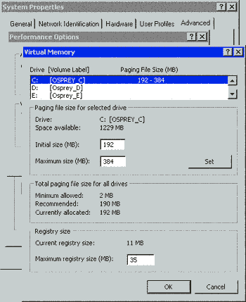 Кроме того, рекомендуется присвоить исходному размеру файла (Initial size) и его максимальному размеру (Maximum size) одно и то же значение. Это значение должно быть достаточно велико, чтобы обеспечить нормальный объем виртуальной памяти. Вначале можно установить размер, рекомендуемый по умолчанию, а затем, используя утилиту Performance Monitor, убедиться, не исчерпала ли система объем виртуальной памяти (и, что то же самое, файла подкачки). Присвоение исходному и максимальному размеру одного и того же значения предотвращает разрастание файла и замедление работы системы из-за необходимости поиска и выделения дополнительного пространства.