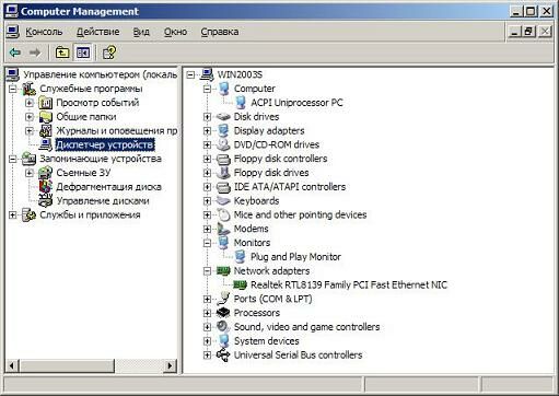 Программа установки Windows Server 2003 хорошо определяет и конфигурирует устройства, но не может решать проблемы связанные с отсутствием драйверов или конфликтом ресурсов. Для проверки работоспособности оборудования компьютера используйте Диспетчер устройств (Device Manager), который входит в состав службы Управление компьютером (Computer Management) из меню Администрирование.