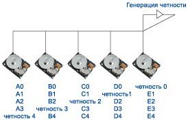 Более высокая эффективность использования дискового пространства достигается за счет более низкой скорости обмена информацией. Во время записи информации в RAID-5 надо каждый раз обновлять информацию о четности. Для этого надо определить, какие именно биты четности изменились. Сначала считывается подлежащая обновлению старая информация. Затем эта информация перемножается по XOR с новой информацией. Результат этой операции - битовая маска, в которой каждый бит =1 означает, что в информации о четности в соответствующей позиции надо заменить значение. Затем обновленная информация о четности записывается на соответствующее место. Следовательно, на каждое требование программы записать информацию, RAID-5 совершает два чтения, две записи и две операции XOR. Таким образом, в RAID уровня 5 скорость записи практически вдвое хуже, чем при использовании одиночного диска. Это самая большая проблема в RAID 5 уровня, и производители RAID-контроллеров ведут интенсивные работы по ее преодолению. Однако наличие такой проблемы еще не говорит о том, что RAID уровня 5 обладает низкой производительностью. При чтении RAID уровня 5 может одновременно обслужить несколько запросов, благодаря чему производительность RAID уровня 5 может оставаться высокой даже при весьма интенсивном потоке запросов на обслуживание. В RAID уровня 5 одновременно также может обслуживаться и несколько запросов на запись. Именно для этого контрольная информация размещается не на одном диске, а чередуется на всех.[