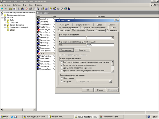 Рассмотрим свойства учетной записи “Гость” в Active Directory. Где возможна настройка времени входа, срок действия учетной записи, имя входа пользователя для учетной записи “Гость.
