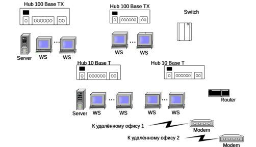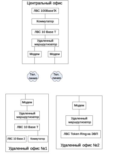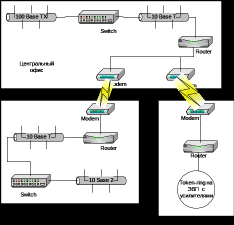 В центральном офисе фирмы расположены ЛВС 100 Base TX , содержащая один концентратор, и ЛВС 10 Base T, содержащая 3 сегмента. Обе сети подключены к коммутатору, к нему также подключен удаленный маршрутизатор с двумя модемами.